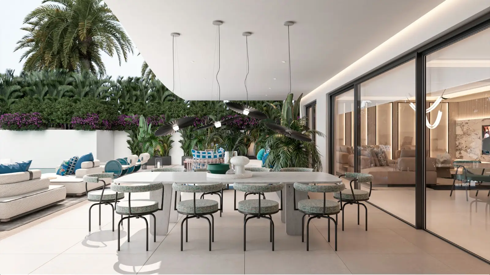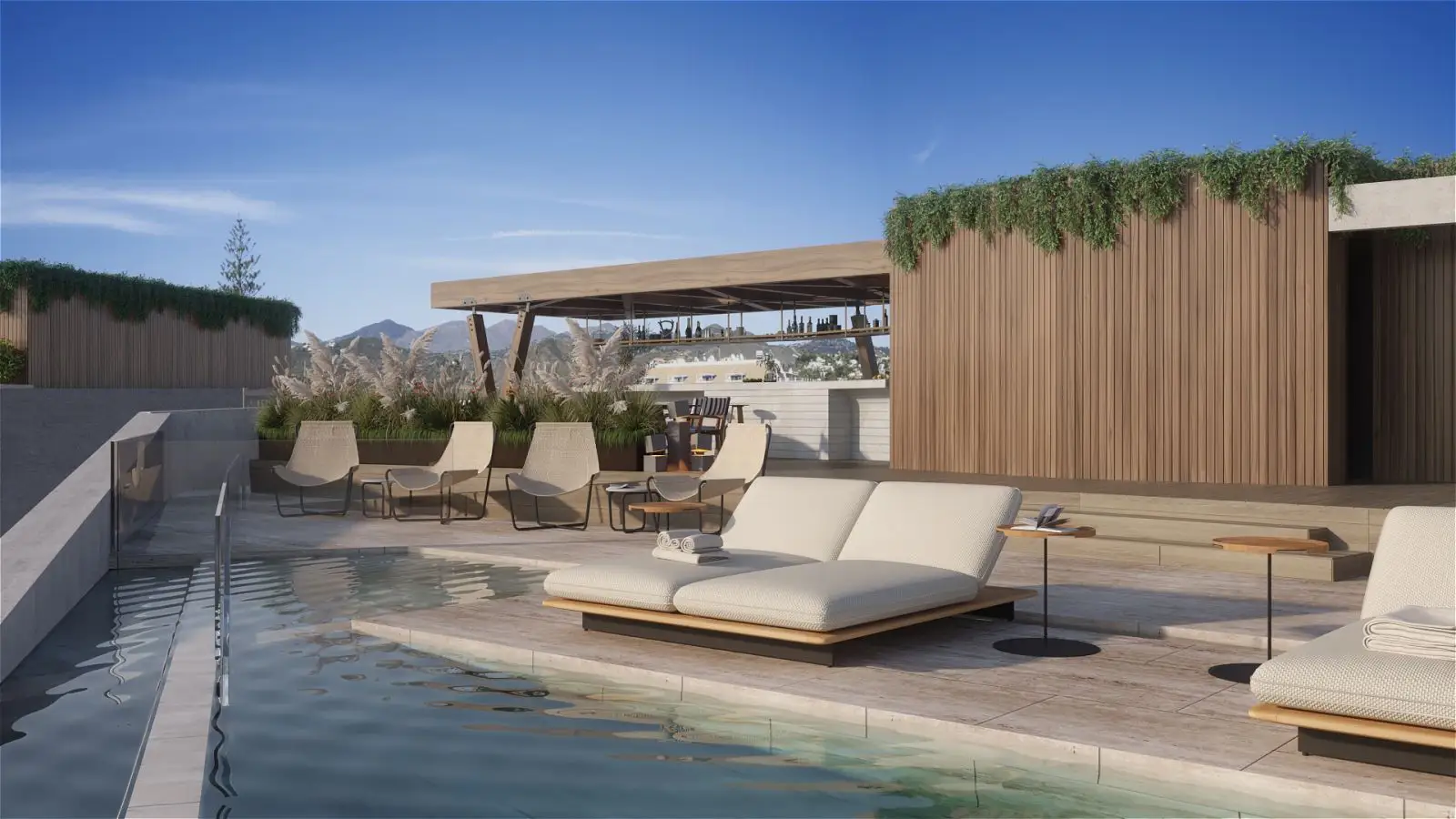 The standout feature of this iconic social space is a breathtaking infinity pool elevated eight meters above ground level, providing uninterrupted views of both the Mediterranean Sea and the surrounding mountains. A stylish cocktail bar encircles the pool, creating the perfect setting to relax and take in the scenery.